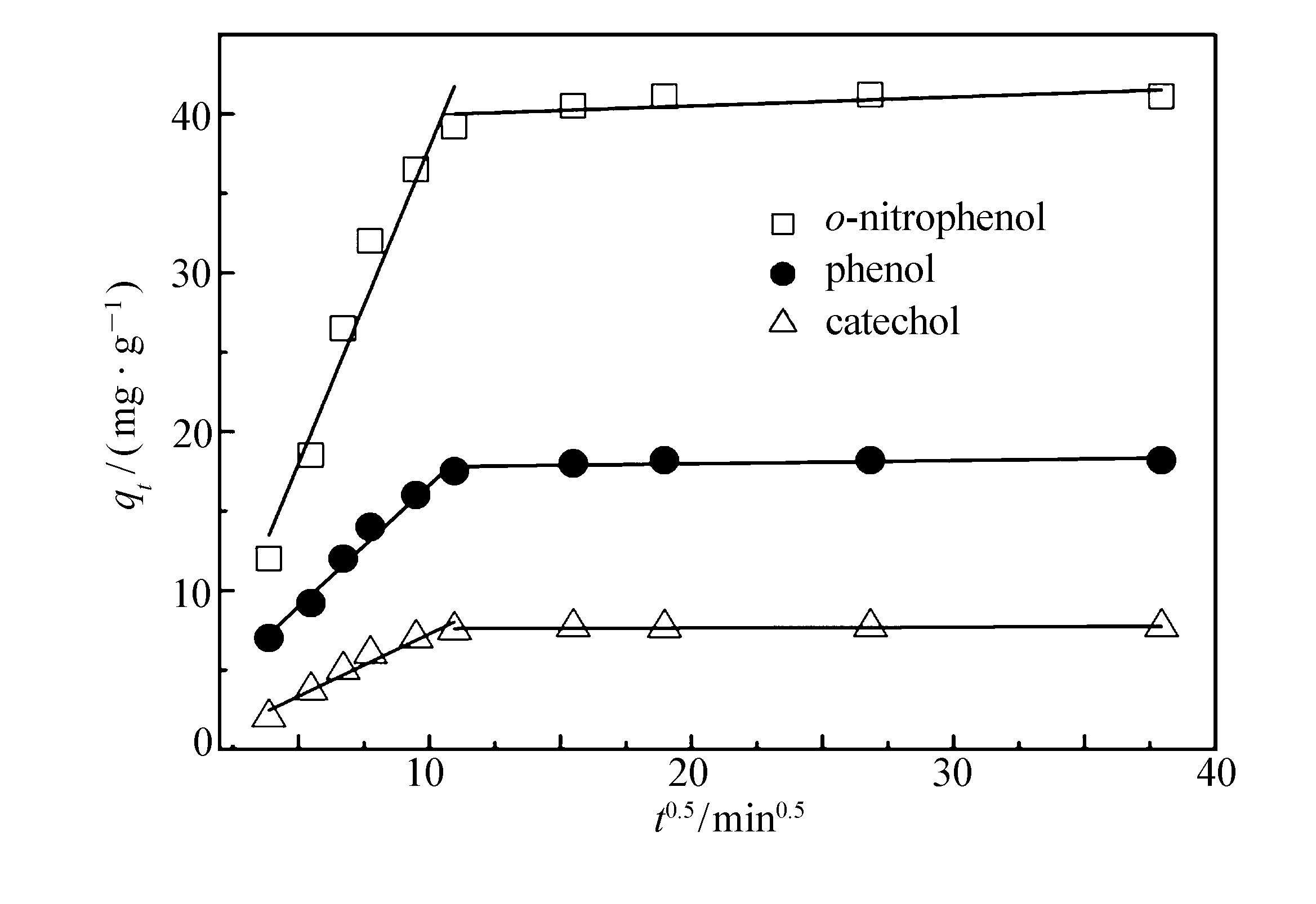 通过孔内扩散模型(式(2))对MIL-53(Al)吸附酚类化合物的吸附动力学曲线进行拟合(图 3)。 式中,qt是在时间t时的吸附量(mg/g),ki是孔内扩散常数(mg/(g·min0.5)),a是截距。 结果表明,MIL-53(Al)对酚类化合物的吸附包括表面吸附和孔内扩散两个过程[21-23]。
