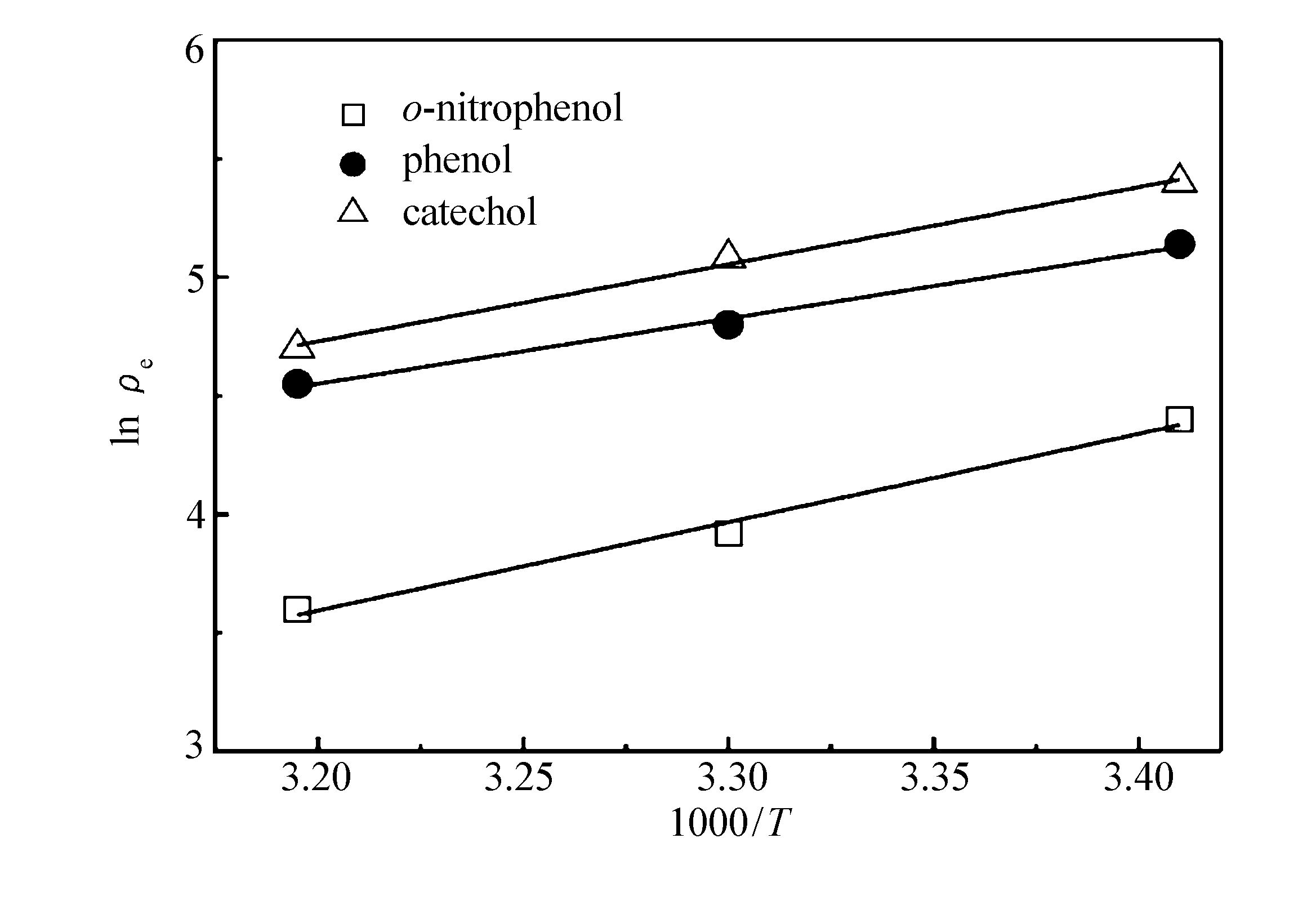 MIL-53(Al)吸附酚类化合物的吸附等温线如图 6所示。 MIL-53(Al)对邻硝基苯酚、苯酚、邻苯二酚的平衡吸附量随着初始浓度的增大而增加,说明高浓度有利于MIL-53(Al)对3种酚类化合物的吸附。 另外,MIL-53(Al)对3种酚类化合物的吸附量随着温度的升高而增大,说明高温有利于MIL-53(Al)对3种酚类化合物的吸附,且MIL-53(Al)吸附该3种酚类化合物为吸热过程。 在40 ℃条件下,MIL-53(Al)对邻硝基苯酚、苯酚和邻苯二酚的吸附量分别是78.6、30.5和16.5 mg/g。