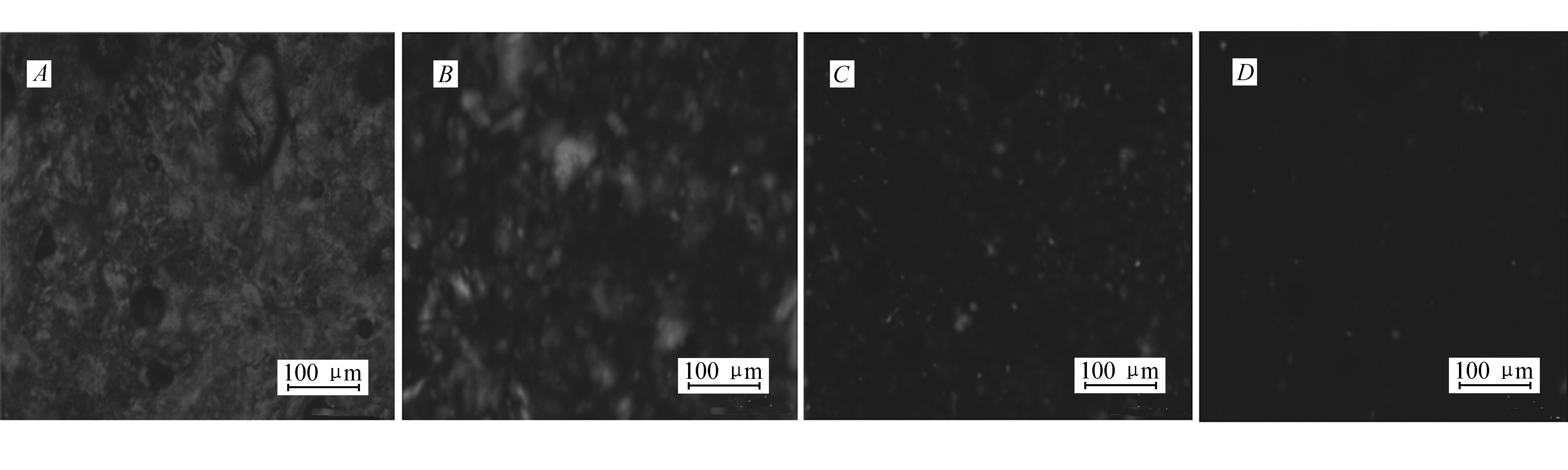 图 5为席夫碱型硅氧烷聚氨酯液晶聚合物在偏光显微镜下拍摄的照片。 经偏光显微镜观察。 在100 ℃时(图 5A)可以观察到样品呈现焦锥织构,温度从100 ℃升至150 ℃时(图 5A~图 5D),样品对光的双折射性逐渐变弱,最终液晶转变成各向同性熔体。 初步判断,该聚合物可能属于近晶相液晶。
