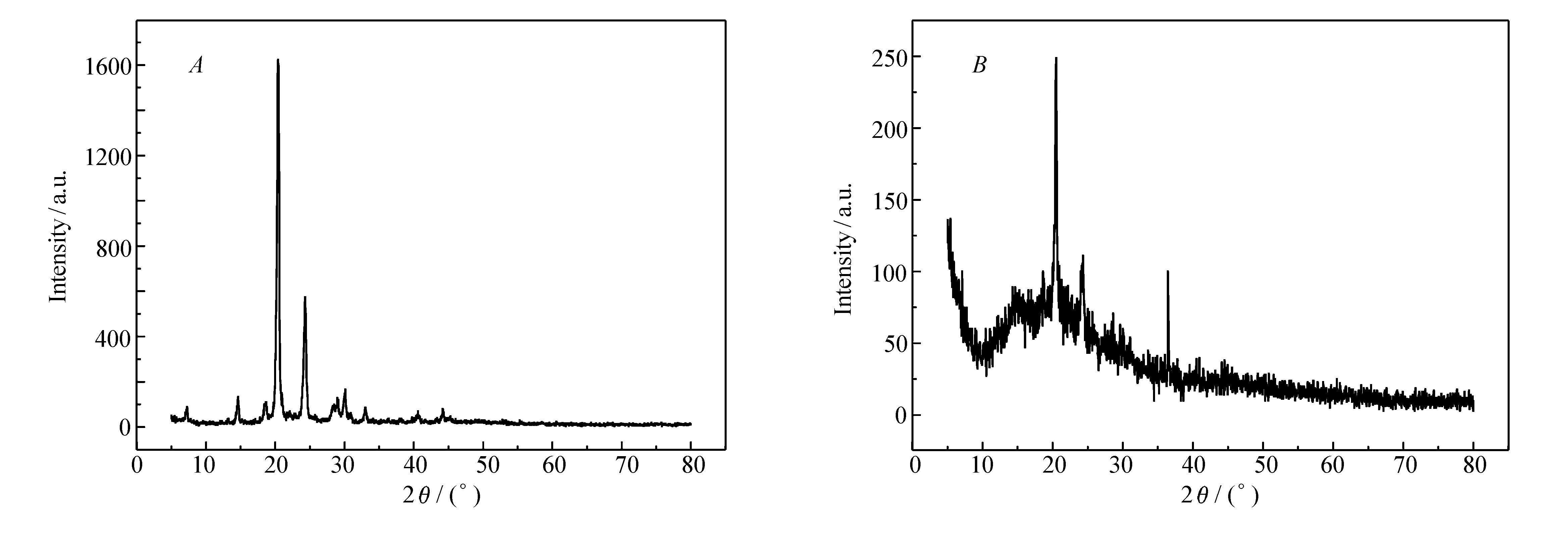 图 6A是液晶基元的X射线衍射图,样品在2θ为5°~32°处有一系列强度不等的衍射峰,在2θ为20.40°、24.68°处有明显的衍射峰,说明在室温下液晶基元有明显的晶体(近程有序)结构。 图 6B是合成的席夫碱型硅氧烷聚氨酯液晶聚合物的X射线衍射图。 与液晶基元比较,在聚氨酯预聚体中引入硅氧烷,晶体衍射峰位并未发生改变,但峰的强度变弱,说明液晶基元的结晶度比席夫碱型硅氧烷聚氨酯液晶聚合物高。 在2θ为20.40°、24.68°、35.62°处有明显的衍射峰,且峰型较为尖锐,说明液晶聚合物具有近程层间横向相互堆砌的更短尺寸的有序性,具有层状结构。 结合偏光显微镜和TG/DSC分析,合成的席夫碱型硅氧烷聚氨酯液晶聚合物为近晶相液晶,液晶范围为103~146 ℃。