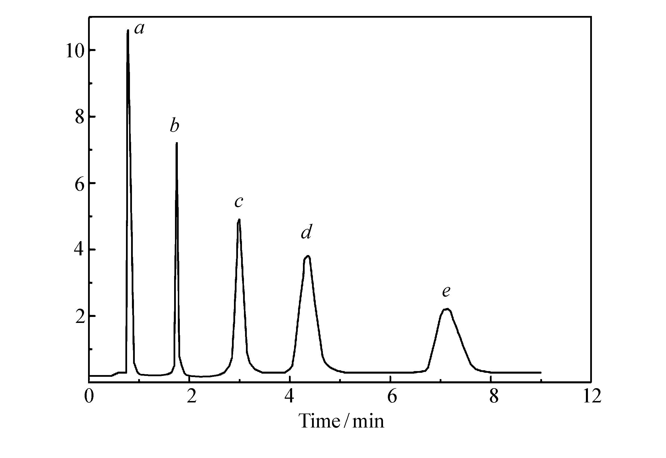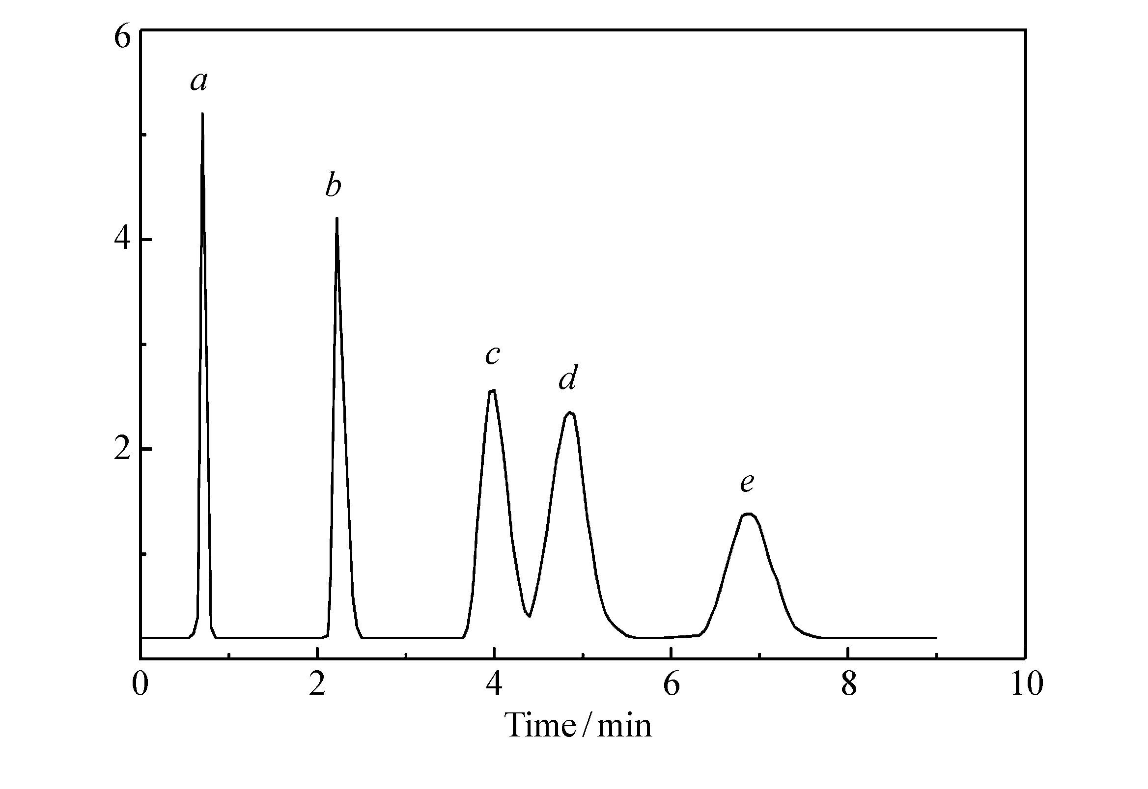 在柱温为135 ℃时,以苯、甲苯、邻二甲苯、溴苯、硝基苯为测试对象,其分离色谱图见图 8。 可见,3种二甲苯得到完全分离。硅氧烷聚氨酯液晶聚合物中有较强的偶极矩和易极化的基团亚胺键,苯、甲苯、邻二甲苯、溴苯、硝基苯的极性依次增强,沸点依次增大,根据相似相溶性及组分的蒸汽压的作用,各组分依次被分开,分离度分别为2.86、3.01、2.08和3.33。