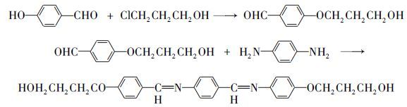液晶基元的合成分为二步:1)羟基丙氧基苯甲醛的合成。利用碳酸钾为催化剂,将4-羟基苯甲醛与3-氯丙醇在DMF溶剂中回流反应,通过亲核取代脱去氯化氢而生成该化合物,产率约为70%。 2)苯二(对苯丙氧基醇)亚胺的合成。 席夫碱的传统合成方法是在酸催化下在有机溶剂中回流进行胺和醛的缩合反应,醛基与伯胺作用,先亲核加成,然后脱水形成含CN键的取代亚胺。 本文在冰醋酸催化剂下,将对羟基苯甲醛和对苯二胺(摩尔比为2∶1)在无水甲醇中回流反应合成液晶基元,产率约为85%。 合成反应式如Scheme 1所示。