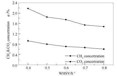 在反应压力1MPa,甲醇质量空速0.6h-1条件下,反应稳定后进行分析,考察反应温度对甲醇裂解制氢反应性能的影响,结果见图 7和图 8。由图 7可知,由于甲醇裂解制氢反应为吸热反应,因此, 随着反应温度的升高,甲醇转化率和气体收率表现出上升趋势,在280-290℃趋于平缓。由图 8可知,产品气副产物CH4与CO2的浓度随着温度的升高而升高。因此, 综合考虑甲醇转化率以及副产物CH4与CO2的含量,宜取280℃作为反应温度。