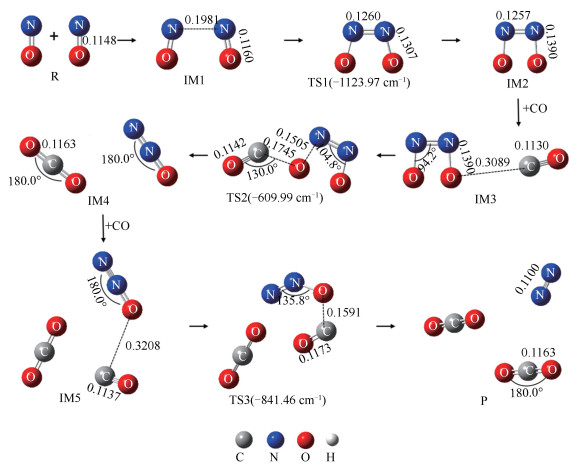 均相NO-CO反应的反应过程与能量变化见图 2, 反应中涉及的各驻点结构见图 3。需要注意的是, 反应路径中每一阶段内各驻点的能量均为相对于此阶段内反应物能量的能量之差。