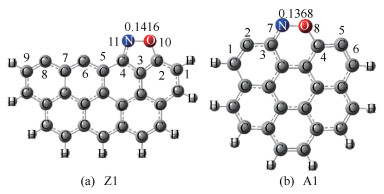 在焦炭表面进行的异相反应均以化学或物理吸附作为反应的第一步。对于本研究焦炭表面CO还原NO的异相化学反应, NO在焦炭表面的吸附是整个还原反应的第一步。研究指出[18], NO在焦炭表面吸附可分为O-down、N-down与Side-on三种方式, 其中,O-down与N-down吸附方式表现为NO分子中的O原子与N原子分别单独吸附在焦炭表面活性位点, 而Side-on吸附方式则表现为NO分子水平吸附在焦炭表面上两个活性位点。Kyotani等[30]的研究表明, 相较于其他两种吸附方式, NO主要以Side-on方式吸附于焦炭表面。因此, 本研究在对异相反应的机理研究中, 均采用NO以Side-on方式吸附在Zigzag与Armchair焦炭表面上的构型作为起始反应物, 优化后的NO吸附结构如图 4所示, 并给出了吸附在焦炭表面的N-O键键长。同时为便于描述, 对焦炭模型中所有参与反应的原子进行了编号。
