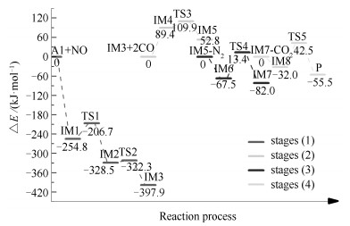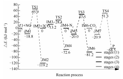 Figure 5  Potential energy surface change of heterogeneous NO-CO reaction catalyzed by Zigzag char