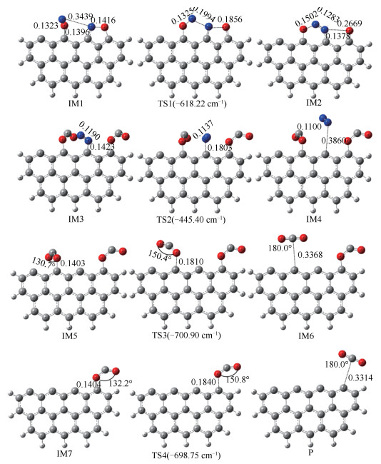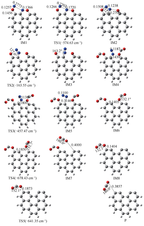 Zigzag型焦炭催化异相NO-CO反应的过程与能量变化见图 5, 反应中涉及的各驻点结构见图 6。为便于描述, 将该反应路径称为路径1。