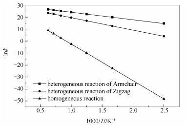 图 9可知, 随着温度的上升, 各反应路径的速率常数均增大, 该趋势同文献中各实验结论一致[8-10], 说明提高温度对NO还原反应起到促进作用。在所选温度范围内, 异相反应的速率常数均大于同温度下的均相反应的速率常数; 并且在异相反应中, Armchair型焦炭表面NO还原反应的速率常数大于同温度下Zigzag型焦炭表面NO还原反应的速率常数。此外可以看出, 在低温下, 均相反应的速率常数明显小于异相反应的速率常数, 因此, 可以认为, 在同时存在均相与异相反应的条件时, 均相反应几乎不发生; 随着温度的上升, 与异相反应相比, 均相反应的反应速率上升更快, 这说明均相NO还原反应受温度的影响更大。