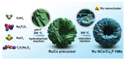 Herein, we presented an in situ green phosphating strategy without any extrinsic phosphorus sources for ruthenium nanoclusters anchored on cobalt phosphide hollow microspheres (Ru NCs/Co2P HMs), which exhibited remarkable tolerance of wide-pH and multifunctional electrocatalyst for HER and oxygen evolution reaction (OER). The phosphorus source was derived from its own phosphate group of cobaltous phosphate, which was reduced by hydrogen atmosphere to break the P-O bonds.