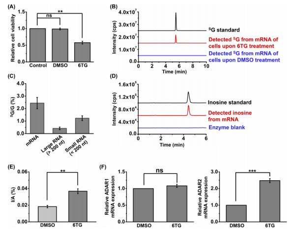 Figure 1 Evaluation of the incorporation of SG in RNA and investigation of the effect of 6TG on the level of inosine in mRNA. (A) 6TG treatment reduces cell viability. (B) Analysis of SG incorporated in mRNA by LC-ESI-MS/MS. Shown in black, red and blue are the extracted-ion chromatograms of SG standard, detected SG from mRNA of Jurkat-T cells upon 6TG treatment (3 µmol/L for 24 h), and upon DMSO treatment, respectively. (C) Quantification of SG incorporated in mRNA, large RNA (> 200 nt) and small RNA (< 200 nt) by LC-ESI-MS/MS analysis. (D) Detection of inosine in mRNA by LC-ESI-MS/MS analysis. Shown in black, red and blue are the extracted-ion chromatograms of inosine standard, detected inosine from mRNA of Jurkat-T cells, and enzyme blank control, respectively. Enzyme blank samples represent the samples only containing enzymes used for digesting RNA. (E) Quantification of inosine level in mRNA of Jurkat-T cells with and without 6TG treatment based on LC-ESI-MS/MS measurement. (F) The relative levels of ADAR1 and ADAR2 in Jurkat-T cells upon 6TG treatment (3 µmol/L for 24 h) compared to control (DMSO treatment). ** P < 0.01 (n = 3); *** P < 0.001 (n = 3); ns, not significant.