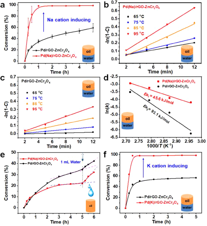 Figure 1.  (a) Catalytic performance over Pd(Na)/rGO-ZnCr2O4 and Pd/rGO-ZnCr2O4. (b, c) Time-conversion plots at various temperatures for Pd(Na)/rGO-ZnCr2O4 and Pd/rGO-ZnCr2O4 catalyst, respectively. (d) Arrhenius plots for BA oxidation. (e) Response of water injection over the Pd(Na)/rGO-ZnCr2O4 and the corresponding Na-free catalyst for BA oxidation, with toluene as reaction solvent. (f) Catalytic activity test over Pd(K)/rGO-ZnCr2O4 and Pd/rGO-ZnCr2O4.