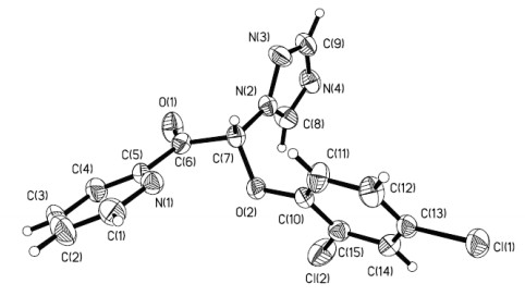 1-(吡啶-2-基)-2-(2, 4-二氯苯氧基)-2-(α-1H-1, 2, 4-三唑-1-基)乙酮(4k):白色固体, 产率71%. m.p. 96~98 ℃; 1H NMR (CDCl3, 300 MHz) δ: 7.17~7.36 (m, 3H, Ar-H), 7.52~7.57 (m, 1H, Py-H), 7.89~7.95 (m, 1H, Py-H), 7.97 (s, 1H, Tr-CH), 8.03 (s, 1H, Tr-H), 8.19 (d, J=7.8 Hz, 1H, Py-H), 8.62 (s, 1H, Tr-H), 8.64 (d, J=4.8 Hz, 1H, Py-H). 13C NMR (CDCl3, 75 MHz) δ: 84.2, 119.6, 123.8, 126.0, 128.2, 128.5, 129.8, 130.4, 137.5, 144.8, 149.4, 150.3, 150.8, 152.0, 187.6. Anal. calcd for C15H10Cl2N4O2: C 51.60, H 2.89, N 16.05; found C 51.47, H 2.87, N 15.88.