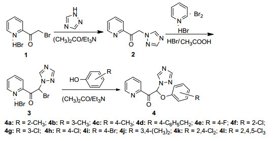 在一100 mL圆底烧瓶中, 加入5 mmol中间体2-(α-溴代-α-1H-1, 2, 4-三唑-1-基)乙酰基吡啶(3)及10 mL二氯亚砜, N2保护下, 室温搅拌片刻后, 在冰浴条件下向其中滴加6 mmol取代基苯酚、12 mmol三乙胺和丙酮(20 mL)的混合溶液, 滴毕, 继续在0 ℃搅拌4~5 h左右.停止反应, 抽滤, 减压蒸除溶剂, 所得残余物用60 mL氯仿溶解, 依次用水、稀氢氧化钠水溶液、水洗涤, 无水硫酸镁干燥.抽滤, 脱溶, 残余物经柱层析[V(石油醚):V(乙酸乙酯)=3:1]分离得到目标化合物4a~4l.