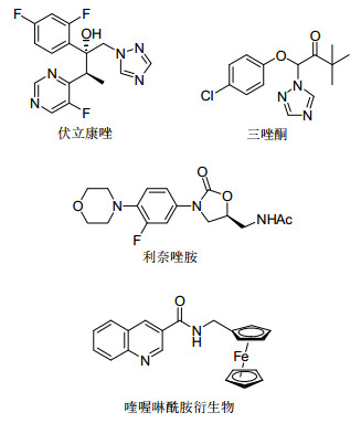 含1, 2, 4-均三唑结构的杂环类分子具有广泛的生物活性, 如抗炎、抗病毒和抗微生物和抗肿瘤等[3~6], 如已在临床应用的伏立康唑(图 1)中即含药效基团三唑; 通过将不同活性基团构筑于同一分子中能够有效的改善其生物活性, 如已应用于农业生产中的三唑酮(图 1)分子中同时具有三唑和对氯苯基, 成为一种高效、低毒的杀菌剂和除草剂; 吗啉环作为一种重要药效基团也已存在于多种药物和农药中[7~10], 如已用于治疗由特定微生物引起感染的利奈唑胺(图 1); 在药物分子中引入二茂铁基元, 可提高其药效, 已成为设计筛选用于治疗耐药性的癌症和疾病的重要方法之一, 如二茂铁喹喔啉酰胺(图 1)因引入二茂铁基团从而提高了化合物的抗结核活性.