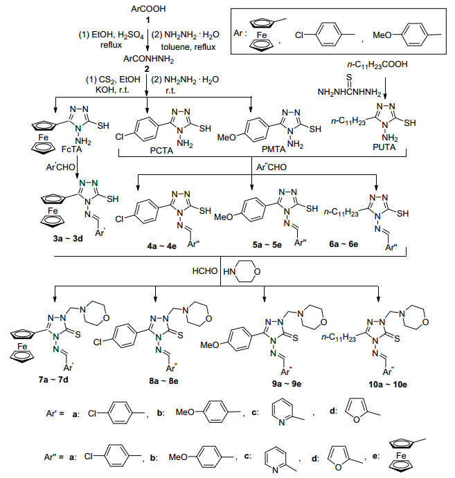 为了探究不同药效基团在分子中相同位点和相同基团在不同位点对分子生物活性的影响, 本文以1, 2, 4-均三唑为模板, 分别在其3号位引入二茂铁基、对氯苯基、对甲氧苯基和正十一烷基, 然后借助4号位氨基分别引入二茂铁、对氯苯基、对甲氧苯基, 以从两个不同角度研究其构效关系.同时为了比较取代苯基、二茂铁基与吡啶、呋喃等杂环基团在4-位生物活性的差别, 分别将吡啶、呋喃基团引入到4种三唑分子中, 设计了19种Schiff碱, 最后通过多组分一锅法将3-取代基-1, 2, 4-均三唑Schiff碱和吗啉对接在同一个分子, 设计了新型系列Mannich碱, 并对其抑制Cdc25B、植物生长调节和除草活性进行了评价, 期待筛选出良好的Cdc25B抑制剂和性能优良的植物生长调节剂.目标分子合成路线如Scheme 1所示.