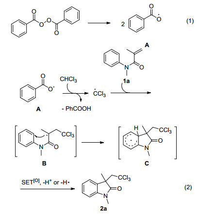 Table 3. Reaction of N-arylacrylamides with CH2Cl2根据相关文献报道[3i, 6], 我们提出了可能的反应机理, 如Scheme 1所示.首先BPO裂解产生自由基A, 进而攫取氯仿的氢产生三氯甲基自由基.随后, 三氯甲基自由基对N-甲基芳基丙烯酰胺(1a)的双键发生加成反应而生成中间体B, 中间体B经分子内自由基加成获得中间体C, 最后C通过单电子转移并失去氢质子或者直接被自由基A(或三氯甲基自由基)夺去氢自由基从而得到目标产物2a.