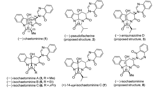 内生真菌是结构多样且具有重要生理活性天然产物的丰富来源[8~10]. 2006年, 谭仁祥课题组从取自南沙参(Adenophora axilliflora, 杏叶沙参)叶子的内生真菌毛壳菌属IFB-E015 (Chaetomium sp. IFB-E015)的固态培养基中分离到毛壳菌素(chaetominine, 1, 图 1)[11].该天然产物是一新颖骨架的三肽衍生物.由于分子中含有喹唑啉酮环, 因此也被归入喹唑啉酮类生物碱[12, 13].在谭小组的工作发表后, 其他实验室也分别从贵州省收集到的陆生真菌Aspergillus sp. HT-2[14]和寄附于苦竹(Pleio-blastus amarus)的内生真菌Aspergillus sp. YL-6[15]分离到毛壳菌素(1).值得注意的是, 近年来多个研究小组分别报道从不同来源的内生菌分离鉴定出毛壳菌素的同系物及其非对映立体异构体, 包括(-)-pseudofischerine (2)[16], (-)-aniquinazoline D (3)[17], (-)-isochaetominines A~C (4~6)[18]和(+)-14-epi-isochaetominine C (7)[18].