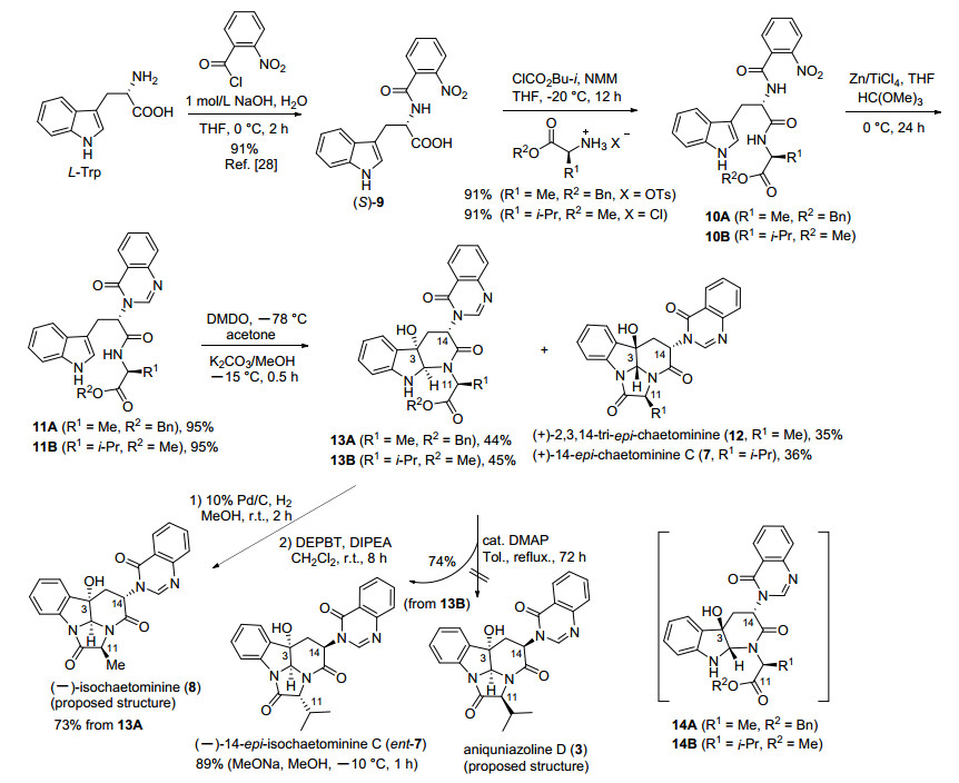 由于isochaetominine推测结构8为C(11)-C(14)顺式立体结构, 其合成需要采用本实验室发展的第三代合成策略[35], 即L-色氨酸与L-丙氨酸苄酯组合.基于这一策略, 我们依Scheme 1进行了isochaetominine推测结构8的全合成.合成始于L-色氨酸的N-邻硝基苯甲酰化, 所得色氨酸衍生物9与丙氨酸苄酯的对甲苯磺酸盐缩合, 得二肽衍生物10A, 收率91%.在优化条件下, 10A经史达清等[37]的喹唑啉-4(3H)酮合成法转化为11A, 收率95%.接着进行关键的环氧化启动的串级反应.为此, 11A与DMDO在丙酮中, -78 ℃下反应1 h, 接着加入K2CO3/MeOH, 并在-15 ℃下反应30 min, 以35%和44%的产率得到化合物12和13A.前者为β-环氧化立体异构体(未画出)经单环化中间体14A的串联双环化产物, 后者为α-环氧化立体异构体(未画出)的单环化产物.化合物13A经钯/碳催化氢解去苄基和在叶蕴华缩合试剂(DEPBT)[38~41]作用下内酰胺化, 生成天然产物isochae-tominine的推测结构8[36], 两步总产率为73%.然而, 合成产物与天然产物isochaetominine[36]的核磁共振氢谱和碳谱不一致.此外, 文献报道的天然产物的比旋光值{[α]D25-110.9 (c 0.1, CH3OH)}与我们合成产物的比旋光值{[α]D25-57.7 (c 1.0, CH3OH)}同样存在很大的差异.