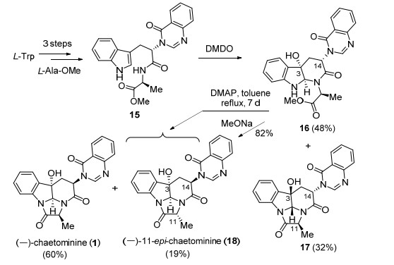得益于本实验室在毛壳菌素类生物碱立体多样性合成方面的积累, 我们先后合成了毛壳菌素类生物碱多个非对映立体异构体[25~28, 35].把它们与天然isochaeto-minine的核磁共振氢谱和碳谱进行比对筛查, 发现本实验室此前从L-色氨酸合成毛壳菌素(1)及其立体异构体17时得到的(-)-11-epi-chaetominine (18) (Scheme 2)[28]与天然isochaetominine的数据一致, 且比旋光值接近{18: [α]D20 -98.0 (c 0.50, CH3OH); 8: [α]D25-110.9 (c 0.1, CH3OH)}.据此, 我们判断文献报道的天然isochaetominine的结构[36]应修正为(-)-11-epi-chae-tominine (18), 其绝对构型为2S, 3S, 11R, 14R.