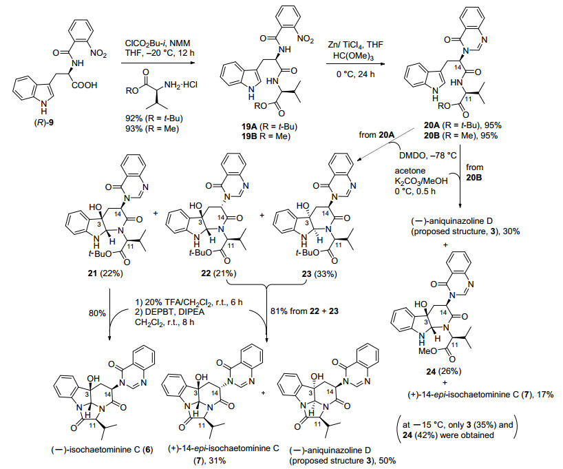 按照通用合成步骤C, 20B (224 mg, 0.50 mmol)的反应得(-)-aniquinazoline D的推测结构[(2S, 3S, 11S, 14R)-3] (65 mg, 产率30%)和(S)-2-{(3R, 4aR, 9aS)-4a-羟基-2-氧代-3-(4-氧代喹唑啉-3(4H)-基)-2, 3, 4, 4a, 9, 9a-六氢-1H-吡啶并[2, 3-b]吲哚-1-基}-3-甲基丁酸甲酯(24) (61 mg, 产率26%)和(+)-14-epi-isochaetominine C (7) (37 mg, 产率17%).