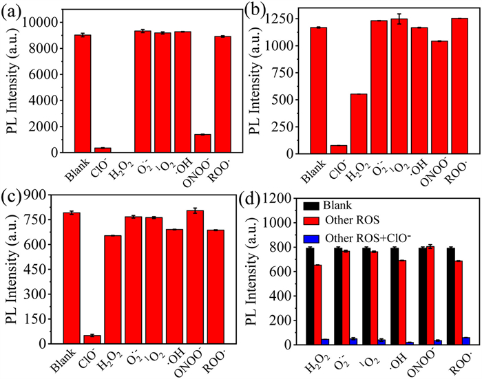 Figure 1  Fluorescence responses of (a) DHIP-CO2Me, (b) DHIP-Me and (c) DHIP-Py toward different ROS (100 µmol/L, 10 equiv.). (d) Fluorescence responses of DHIP-Py toward ClO in the presence of other ROS.
