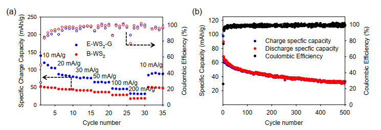 In summary, we have demonstrated the fabrication of a liquid-phase exfoliated WS2 and graphene composite structure as well as the feasibility of reversible K-ion insertion into this composite. The composite anode achieves ~132% more capacity (137 mAh·g-1) than that of the original bulk WS2 (59 mAh·g-1), good rate capability (32 mAh·g−1 at a current density of 200 mA·g−1), and a long lifespan (~50% capacity retention over 500 cycles). These results highlight the WS2-graphene composite as a promising anode for high-stability and long-lifespan K-ion batteries. Moreover, the "liquid-exfoliation to filtration" method may directly extend to other two-dimensional electrode materials to further explore advanced electrode materials for K-ion batteries.
