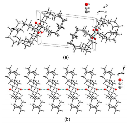 在图 2所示化合物4的晶体结构中, 图 2(a)显示平视所有分子均依靠范德华作用力采取完全平行的排列方式, 沿b轴方向两分子间的质子-质子最小距离为0.2499 nm, 侧视所有分子也依靠范德华作用力采取完全平行的排列方式, 沿c轴方向两分子间的质子-质子最小距离为0.2395 nm, 这与其它取代环十二烷或环十二酮衍生物的晶体结构中分子间采取的平行或反平行的排列方式非常相似, 但是图 2(b)从俯视角度观察所有分子沿a轴方向采用分子间氢键(表 4)呈现类似摞光盘一样完全重叠的自组装排列方式, 沿a轴方向两分子间的氧原子-氧原子最小距离为0.3132 nm, 碳环质子-碳环质子最小距离为0.2574 nm, 这在其它取代环十二烷或环十二酮衍生物的晶体结构中尚未观察到这种自组装特性, 而在其它一些大环化合物中已经观察到这种重要的自组装行为并在生物体内的离子传输过程中具有重要的应用[23].