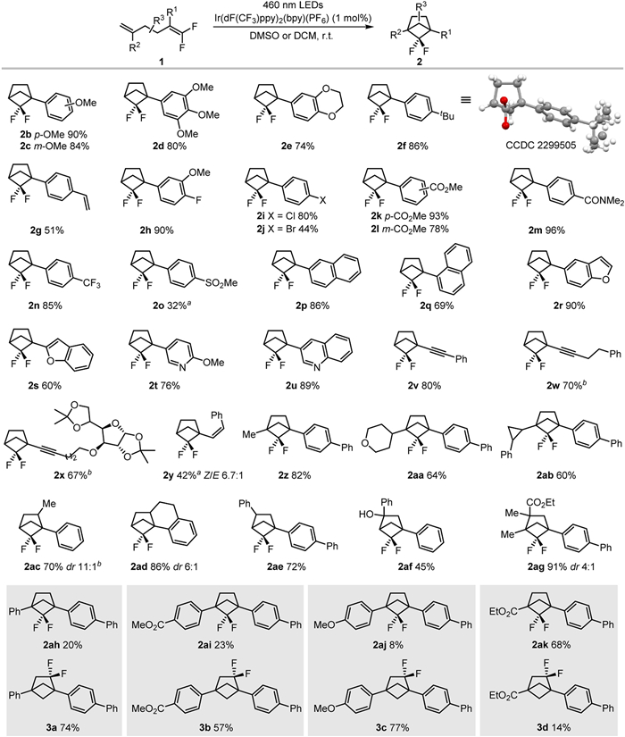 Figure 2  Substrate scope for the synthesis of 5,5-difluorobicyclo[2.1.1]hexanes. Reaction conditions: 1 (0.2 mmol, 1.0 equiv.) and Ir(dF(CF3)ppy)2(bpy)(PF6) (0.002 mmol, 1 mol%) in DMSO or DCM (0.3 mL) was irradiated under Blue LEDs (460 nm) at room temperature. aA telescoped procedure was used and overall yield of two steps was indicated. bIr(dF(CF3)ppy)2(dtbbpy)(PF6) was used instead of Ir(dF(CF3)ppy)2(bpy)(PF6).