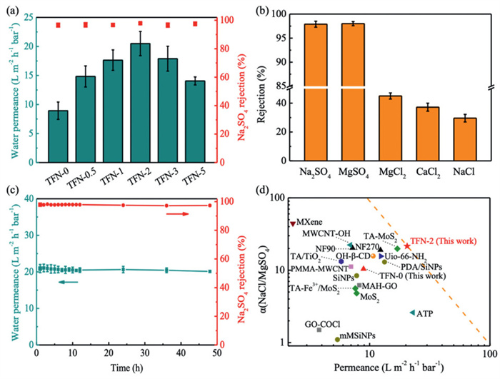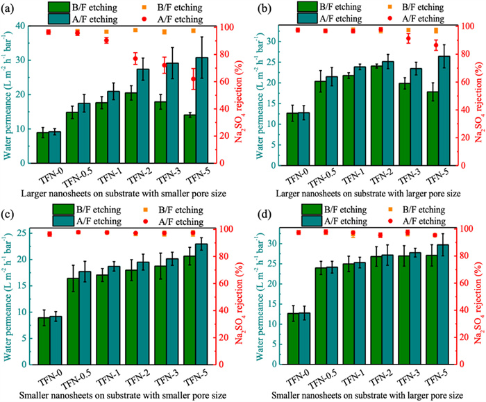 • Thin-film nanocomposite (TFN) membranes have garnered considerable attention for their potential to improve separation performance by incorporating nanomaterials. However, challenges such as these materials' uneven distribution and aggregation have hindered practical applications. While prior studies have largely concentrated on modifying nanosheets for compatibility with polymer matrices, the role of substrate pore size in influencing nanosheet distribution has been overlooked. In this work, MoS2 nanosheets were dispersed in an aqueous phase to fabricate TFN membranes, investigating the effect of substrate pore size relative to the nanosheets. By systematically varying the particle size of MoS2 and the pore size of the substrate, we reveal how these factors impact material distribution and structural uniformity within the membranes. Our findings reveal that larger substrate pores allow the MoS2-containing monomer solution to infiltrate more effectively, minimizing nanosheet aggregation. This enhances membrane performance by promoting better dispersion. Our results underscore the importance of considering the relative size of substrate pores and nanosheets in TFN membrane design, providing a pathway to improved material integration and higher membrane efficiency.