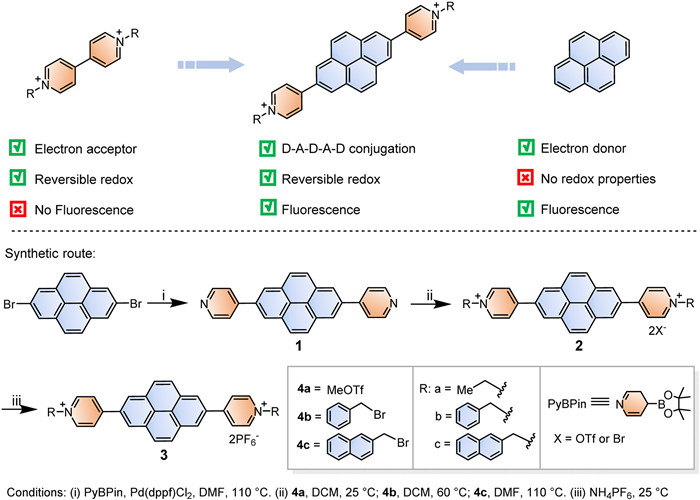 D-A-D-A-D conjugated pyrenoviologens for electrochromism, electrofluorochromism, and detection of picric acid