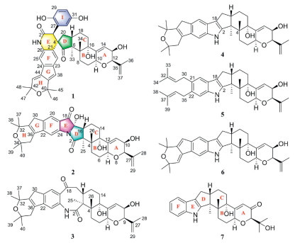 . Niduenes A−F, six functionalized sesterterpenoids with a pentacyclic 5/5/5/5/6 skeleton from endophytic fungus Aspergillus nidulans. Chinese Chemical Letters,