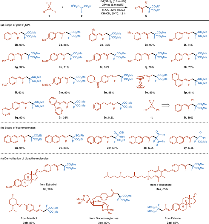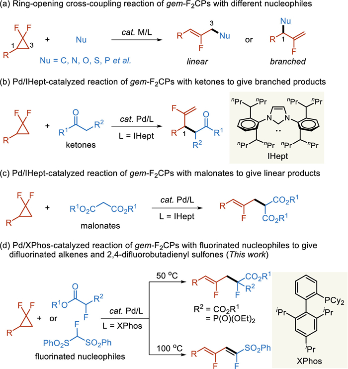 Palladium-catalyzed ring-opening defluorinative cross-coupling of gem-difluorocyclopropanes with fluoromalonates or fluorobis(phenylsulfonyl)methane