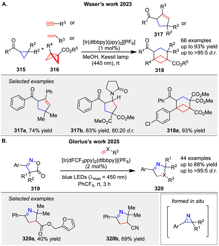 • Radical cycloaddition reactions (RCRs) are highly effective methods for constructing complex carbo- and heterocycles, which are frequently encountered in natural products that exhibit intriguing biological properties and hold significant potential for applications in medicinal chemistry. Radical-mediated cycloaddition strategies, which recycle radical character, are particularly appealing because they require only a catalytic amount of reagent and promise reactions with theoretically high atom economy. This review focuses on recent developments and synthetic applications in RCRs, with an emphasis on visible light-induced radical photocycloaddition reactions (RPCRs), transition metal-catalyzed approaches, and small molecule-catalyzed methods. By highlighting some outstanding innovations and addressing current challenges, this review aims to identify potential areas for improvement. These advancements will provide more efficient pathways for the synthesis of natural product molecules and offer valuable insights for the development of new synthetic methodologies.