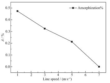 From Fig. 9 it can be found that the main peak is nickel hydroxide, and other crystal items were not observed. When the line speed is 7 m·s-1, the diffrac-tion peak in the XRD spectrum is highest, the half width of the peak is minimum, and the relative crystallinity of the best. If the best relative degree of crystallinity samples prepared at 7 m·s-1 is treated as relative crystallinity of 100%, according to amorphiza-tion formula A=(1-U0Ix / UxI0)×100%, the calculation of amorphous salinity of each sample is plotted in a linear graph, as shown in Fig. 10. Moreover, the rela-tionship between line speed V (m·s-1) and amorphiza-tion: A=1-0.479 4e0.104 1V can be obtained according to Fig. 10.