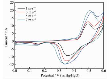 The electrochemical activity is the basic indicator of Ni(OH)2. The Ni(OH)2 samples prepared of different stirring line speeds are compressed with carbon black and adhesive in proportion as 7:2:1 into sheets electrode. CV Scan is tested at the speed of 10 mA·s-1 in the range of 0~0.6 V, while the Hg/HgO is selected as the contrast electrode. The cycle voltammogram is shown in Fig. 12. When the line speed is 7 m·s-1, the area of electrochemical activity and peak current reach the maximum, which show the best electrochemical performance.
