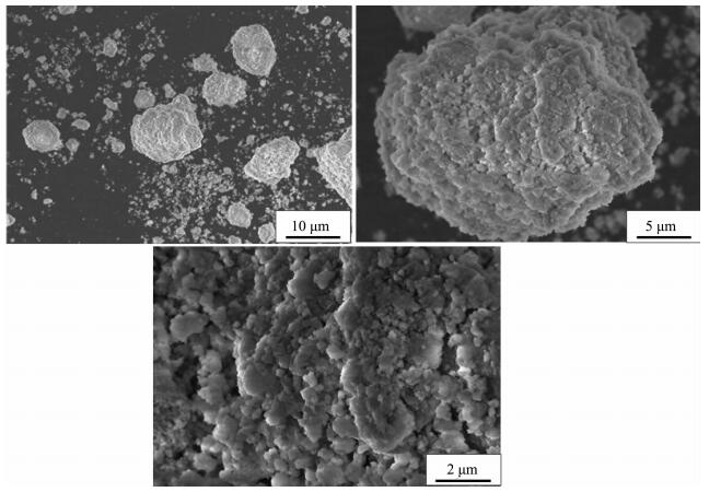 As shown in Fig. 7, when the impeller line speed increases to 5 m·s-1, the fluid flow direction is from bottom to up, which is similar to that when the impeller line speed is 1 and 3 m·s-1. The relatively high liquid flow velocity region at both sides of the shaft and the bottom of the stirring paddle expands and the velocity vector increases. At the A, B and C areas the stirring circulation velocity reactor show little variation with the increase of the stirring paddle line speed, but the mixing circulation range is reduced obviously. Due to increasing the flow velocity vector in the reactor and decreasing the stirring dead zone range, the mixed uniform extent of reactor reactant and cooperation agent raise, same to mixing rate. Ni(OH)2 particles get together and grow into many large spherical crystals (Fig. 7). Since in the reactor flow velocity vector and distribution uniform has not achieved ideal value, the aggregation growth of the spherical crystals does not aggregate, and not collide with each other and break to enter into the secondary crystallization stage, therefore does not form good sphericity of spherical nickel hydroxide crystal.