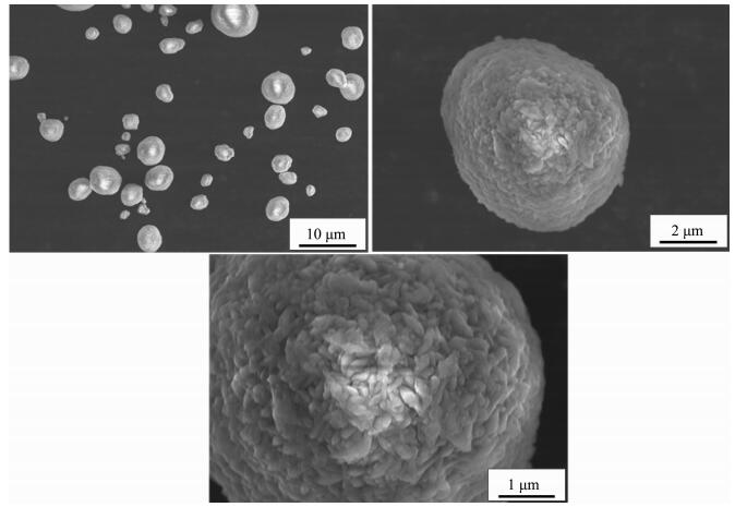When the impeller line speed is 1 m·s-1 and 3 m·s-1, the Ni(OH)2 particles are irregular shape crystals with different size, and the surface of the crystal is formed by the stacking of lamella micro-crystals with attached particles, such as Fig. 1~2. When the impeller line speed is 5 m·s-1, Ni(OH)2 particles formed many near spherical crystals, the surface of which is formed by the accumulation of many well-defined lamellar micro-crystals, such as Fig. 3. When the impeller line speed is 7 m·s-1, Nickel hydroxide particles formed spherical crystals with similar morphology and size, and the surface of these crystals is composed of the accumulation of many micro-crystals with clear stripes, such as Fig. 4.
