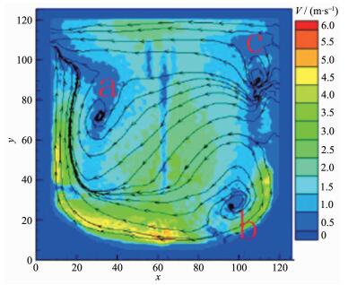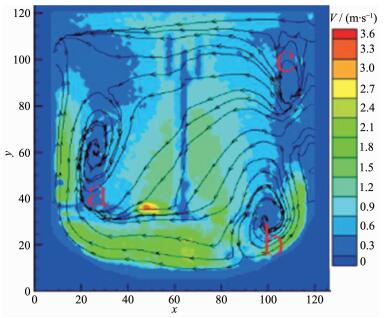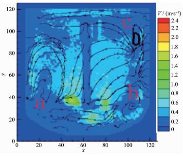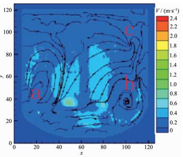 When the impeller line speed is 1 m·s-1, the cloud image of the absolute velocity vector in the reactor is shown in Fig. 5. It can be seen from the graph that in both sides and the bottom area of the mixing paddle the velocity vector distribution is larger, which is the relatively high velocity zone of the liquid flow, and the direction of the liquid flow is from the bottom to the top. Three stirring circulation appeared in the reactor A, B and C areas, and the velocity vector in A, B and C areas is lower than other areas. When the impeller line speed is 3 m·s-1, the cloud image of the absolute velocity vector in the reactor is shown in Fig. 6. It can be seen from the graph that in both sides and the bottom area of the mixing paddle the velocity vector distribution is larger than before, but in the three circulation flow areas the velocity vector distributions show no significantly change. The area such as A, Band C is named as stirring dead zone. In the above two kinds of flow field distribution, because the velocity vector distribution in the reactor is low, the range of the stirring dead zone increases, which leads to the slowly mixing rate of the reaction materials and cooperation agent ammonia, and to low mixed degree of uniformity, consequently the Ni(OH)2 crystal nucleation rate is fast but crystal growth rate is slow, forming amorphous crystalline with varying sizes (Fig. 1~2).