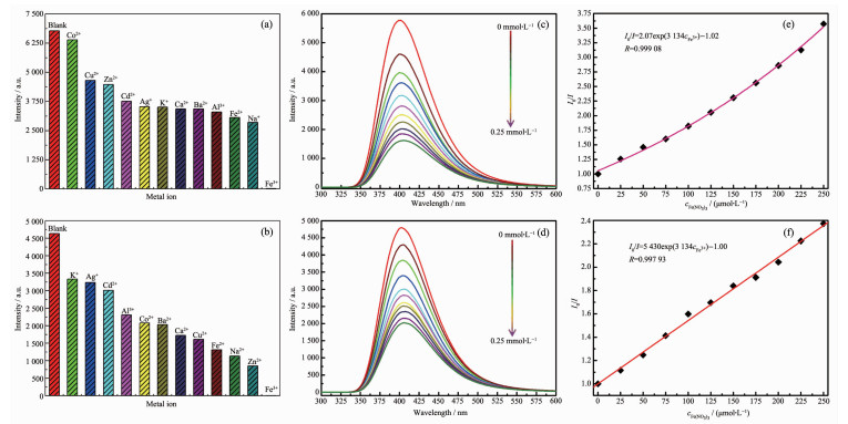 spectra of CP 2 (c) and 3 (d) dispersed in aqueous solutions upon incremental addition of Fe(NO3)3; I0/I vs concentration of Fe(NO3)3 with CP 2 (e) and 3 (f) as sensors