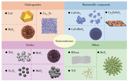 与金属光热材料相比,半导体材料具有太阳光吸收频带宽、生物相容性高、化学稳定性好、种类丰富、成本低、毒性小等优点,现作为一类新型的光热材料被广泛应用于太阳能水蒸发。半导体材料的光热转换机理通常有2种,即类似于金属纳米粒子的LSPR效应与电子-空穴对的产生与弛豫。其中,大部分的半导体都借助电子-空穴对的产生与弛豫生热,而掺杂有特殊价态金属离子的半导体以及含氧型半导体材料也可以产生LSPR效应。为此,我们将半导体光热材料分为硫族化合物、多金属化合物、含氧型化合物以及其他型半导体(图 3),并进行分类讨论。