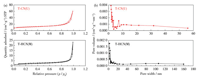Fig. 4a depicts the nitrogen adsorption-desorption isotherm for T-CN(U) closely resembling a type Ⅰ isotherm curve. The surface area and average pore diameter of T-CN(U) and T-HCN(M) were measured by Brunauer-Emmett-Teller (BET) and Barrett-Joyner-Halenda (BJH) methods. The surface areas of T-CN(U) and T-HCN(M) were measured to be 36 and 6 m2·g-1, respectively, while the average pore diameters were 18.75 and 24.19 nm, respectively. According to the test results, T-CN(U) exhibited a large specific surface area and internal pores. These characteristics facilitate the adsorption of reactant molecules and provide more active sites for ion-conversion reactions.