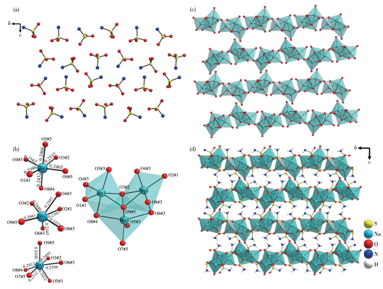 Figure 2  (a) Arrangement of NH2SO3- units in Na(NH2SO3); (b) Coordination environment of Na atoms and the [Na3O11] unit; (c) Chain structure of [Na3O11] units; (d) 3D framework of Na(NH2SO3)