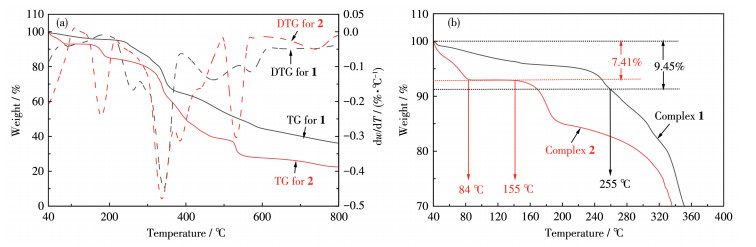 图 4a为2种配合物的TG曲线,可以看出配合物1相比于2分解过程平缓,分解速度较慢。由局部放大图(图 4b)可见,配合物1在255 ℃之前失重9.45%,对应失去的可能是配合物中的游离水和结晶水(理论值为9.49%);在255 ℃之后开始骨架崩塌,失去L1-和2,2′-bipy配体。配合物2在84 ℃之前失重7.41%,对应失去的可能是配合物中的游离水和结晶水(理论值为7.98%);在155 ℃之后开始骨架崩塌,失去L2-和2,2′-bipy配体。因此,失水后的配合物1相比于2热解温度更高,具有更好的热稳定性;并且配合物1在Mannich反应温度范围内仍保留着大部分的游离水和结晶水,仍保持着氢键结构,有利于催化反应的进行。