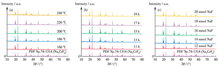Figure 1 XRD patterns of Na3CrF6 phosphors prepared by (a) different reaction temperatures at 17 h reaction time and 18 mmol NaF addition, (b) different reaction times at 220 ℃ reaction temperature and 18 mmol NaF addition, (c) different NaF additions at 220 ℃ reaction temperature and 17 h reaction time