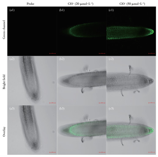 Figure 7  Confocal fluorescence images of Arabidopsis thaliana root tips: (a) Arabidopsis thaliana treated with 10 μmol·L-1 of probe 1 for 30 min; Arabidopsis thaliana treated with 10 μmol·L-1 of probe 1 for 30 min, and then with (b) 20 μmol·L-1 and (c) 50 μmol·L-1 of ClO- for another 30 min