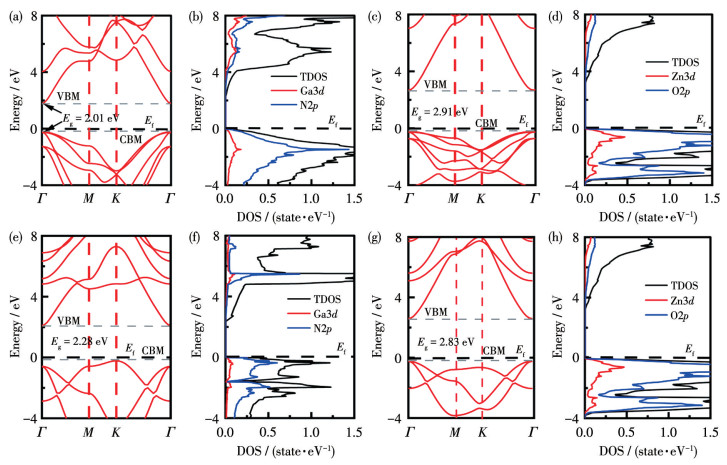 表 3 各掺杂体系的Eb、X—O键长(dX—O)、X—N键长(dX—N)、N—X—N键角(βN—X—N)、O—X—O键角(βO—X—O)和hTable 3. E b, bond length of X—O (dX—O), bond length of X—N (dX—N), bond angle of N—X—N (βN—X—N), bond angle of O—X—O (βO—X—O), and h of the doping systemsSystem Eb / eV dX—O / nm dX—N / nm βN—X—N / (°) βO—X—O / (°) h / nm Li@Ga -3.144 0.197 109.955 0.400 Li@Zn -3.145 0.187 119.870 0.372 Au@Ga -3.108 0.201 116.573 0.283 Au@Zn -3.106 0.209 116.240 0.270 2Li@Ga-l-Zn -2.979 0.187 0.193 115.145 119.738 0.306 2Li@Ga-c-Zn -2.976 0.186 0.194 112.916 117.069 0.257 2Au@Ga-l-Zn -2.989 0.199 0.197 114.926 116.856 0.296 2Au@Ga-c-Zn -2.993 0.212 0.202 105.945 113.972 0.256 Li-Au@Ga-l-Zn -2.965 0.212 0.196 113.664 114.263 0.246 Au-Li@Ga-l-Zn -2.954 0.223 0.210 105.649 112.693 0.263 GaN/ZnO -2.525 0.186 0.186 119.858 119.995 0.401 2.2 电子结构