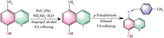 5-Amino-8-hydroxylquinoline (1.6 g, 10 mmol) and 4-methyl benzaldehyde (10 mmol) were added to 50 mL CH3CH2OH at 70 ℃, followed by adding five drops of HCOOH as catalyst. Subsequently, the mixed solution was continuously heated at 85 ℃ for 5 h. The product was separated from the mixture and purified by recrystallization with a mixture of CH3CH2OH and CH3COCH3 (3∶1, V/V). Finally, the purified product was green solid (Yield: 2.1 g, 80.2%) (Scheme 1). Elemental analysis Calcd. for C17H14ON2(%): C, 77.86; H, 5.34; N, 10.69. Found(%): C, 77.65; H, 5.62; N, 10.40. IR (KBr, cm-1): 3 679(s), 2 884(w), 1 574(m), 1 500(s), 1 488(m), 1 407(s), 1 372(w), 1 245(s), 1 195(s), 1 141(m), 1 275(w), 1 185(s), 1 046(w), 1 009(w), 974(w), 880(w), 821(m), 785(s), 705(m), 662(m), 578(w), 505(m). The 1H and 13C NMR spectra of HL are shown in Fig.S1. 1H NMR (400 MHz, CDCl3): δ 8.99-8.75 (m, 2H), 8.59 (s, 1H), 7.91 (d, J=7.9 Hz, 2H), 7.60-7.15 (m, 6H), 2.47 (s, 3H). 13C NMR (101 MHz, CDCl3): δ 158.93, 150.60, 148.34, 141.85, 140.24, 138.17, 133.97, 133.25, 129.57, 128.81, 124.97, 121.52, 113.68, 109.69, 21.68.