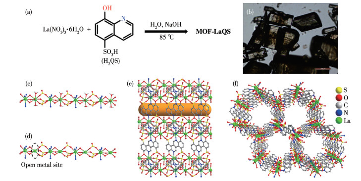 在MOF-LaQS的绿色合成过程中,以水作为溶剂,并通过调节体系的pH值成功合成了该MOF的单晶(图 1a)。结果表明,pH值是影响MOF-LaQS结晶的关键因素。在低pH条件下(pH < 5),配体的去质子化反应受到抑制,导致结晶产物难以生成。然而,当pH被调节至5~6时,水热反应体系在85 ℃下加热24 h后成功获得MOF-LaQS的单晶产物(图 1b)。将反应放大10倍,仍可得到产物,为尺寸不均一的晶体。当反应物浓度变大时,会得到粉末状微晶产品。单晶X射线衍射数据表明,绿色合成法获得的MOF-LaQS晶体结构与以DMF为溶剂合成的晶体结构基本一致,唯一的区别在于通道中的客体分子以及开放金属位点上配位的分子为水分子,而非有机溶剂。单晶X射线衍射结果表明MOF-LaQS晶体结晶于三方晶系P3空间群,晶胞参数为a=b=1.638 nm,c=0.974 nm。在MOF-LaQS的不对称结构单元中,含有1个完全去质子化的QS2-阴离子、1个La3+离子、2个配位水分子和3个游离水分子。所有La3+离子都呈九配位模式,其中La1分别与3个不同的QS2-配体上的磺酸基团上的O原子、3个羟基上的O原子桥联,并与3个配位水分子配位,形成九配位模式;La2则与3个不同的QS2-配体上的磺酸基团上的O原子单齿连接,并与3个不同的QS2-配体的3个羟基O原子和吡啶上的N原子螯合配位形成九配位模式。除去配位水后,晶体孔道内将存在大量开放的金属位点(图 1c和1d)。此外,MOF-LaQS具有一维通道,孔径约为1.6 nm(图 1e和1f)。单晶测试分析结果表明,MOF-LaQS的孔道内有18个游离水分子,而元素分析显示,孔道内只有6个水分子,这可能是在放置干燥的过程中部分水分子挥发导致。
