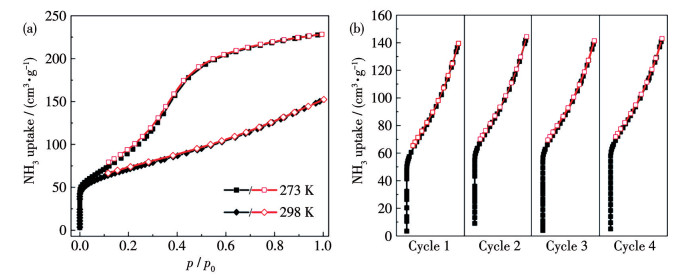 基于MOF-LaQS优异的稳定性和多孔性,在298 K、101 kPa的条件下,测试了MOF-LaQS对NH3的捕获性能。在NH3吸附实验前,先将MOF-LaQS浸泡在乙腈溶液中24 h,随后在150 ℃下活化MOF-LaQS以去除其孔道内的客体分子。相比于其他MOF基NH3吸附剂,MOF-LaQS的活化温度较低[8]。如图 3a所示,在298 K、101 kPa条件下,其最大吸附量可达152 cm3·g-1(6.78 mmol·g-1);当温度降至273 K时,由于NH3饱和蒸气压的降低,吸附量进一步提升至228 cm3·g-1(10.2 mmol·g-1)。更为突出的是,即使在0.101 kPa的极低压力下,MOF-LaQS仍能保持48 cm3·g-1(2.14 mmol·g-1)的显著吸附量。这一现象表明NH3分子与MOF-LaQS之间存在强烈的相互作用。此外,在150 ℃加热条件下,MOF-LaQS中的NH3可以完全脱去。在298 K下经过4次循环测试后,MOF-LaQS对NH3的吸附量并没有明显衰减(图 3b)。这表明MOF-LaQS在NH3捕获领域具有潜在的应用价值。通过晶体结构分析发现,材料中存在大量开放的金属位点,结合其在极低压力下仍保持高吸附量的特性,推测NH3分子可能主要吸附在开放的La3+位点上。