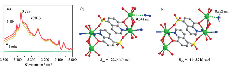 图 4. (a) 室温下MOF-LaQS对NH3吸附后的原位FTIR谱图; DFT计算的MOF-LaQS对(b) N2和(c) NH3的吸附构型Figure 4. (a) In situ FTIR spectra of MOF-LaQS after adsorption of NH3 at room temperature; DFT-calculated adsorption configurations of MOF-LaQS for (b) N2 and (c) NH3In panel b and c: green=La, gray=C, blue=N, red=O, yellow=S.